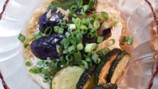 ますます蒸し暑くなる季節。本日の夕食はさっぱりするそうめんにすることしました。冷蔵庫の中には、なすとピーマン、ズッキーニが入っています。これをごま油で揚げ、そうめんにトッピングしようと思いました。ぶっ...